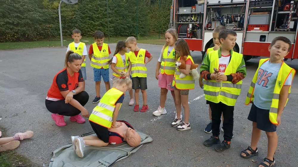 Specjalnymi gośćmi pikniku byli strażacy z Państwowej Straży Pożarnej w Miechowie, policjanci z Komendy Powiatowej Policji w Miechowie oraz ratownik medyczny – Anna Stempińska. a prywatnie mama drugoklasistki, Mai.