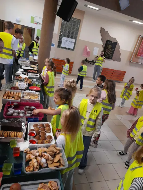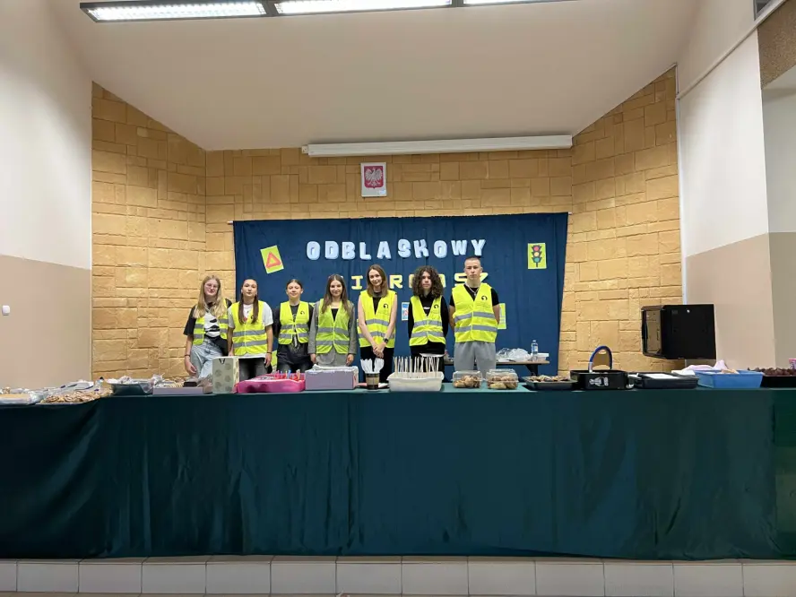 Jednak to wydarzenie miało również drugie, niezwykle ważne przesłanie – promocję bezpieczeństwa na drodze. Samorząd Uczniowski przypominał o konieczności noszenia kamizelek i elementów odblaskowych, które ratują życie, szczególnie w okresie jesienno-zimowym. Dzięki temu kiermasz nie tylko osłodził dzień, ale też uświadomił społeczności szkolnej, jak istotne jest dbanie o własne bezpieczeństwo.