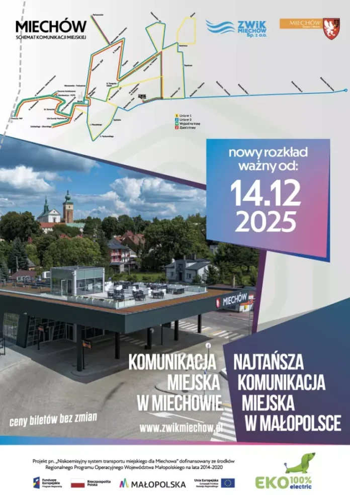 WiadomościMiechów Od 14 grudnia będzie zmiana rozkładu komunikacji miejskiej w Miechowie Przez Krzysztof Capiga - 9 grudnia 2025 0 21 FacebookTwitterPinterest Od najbliższej niedzieli 14 grudnia 2025 roku wprowadzone zostają zmiany w komunikacji miejskiej w Miechowie. Trasy kursów autobusów elektrycznych dostosowano do kolejnej zmiany rozkładu SKA. [Pokaz zdjęć]