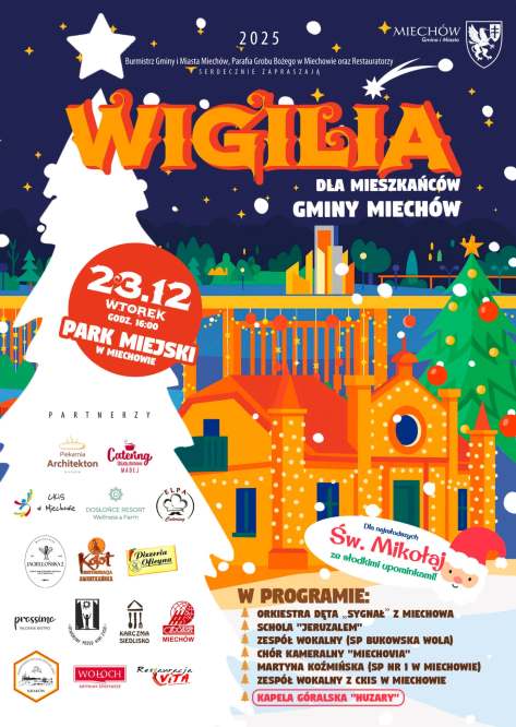 Burmistrz Gminy i Miasta Miechów, Parafia Grobu Bożego w Miechowie oraz lokalni restauratorzy serdecznie zapraszają na Wigilię dla Mieszkańców Gminy Miechów. Wydarzenie odbędzie się we wtorek, 23 grudnia 2025 roku od godz. 16:00