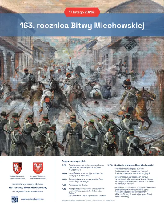Dariusz Marczewski Burmistrz Gminy i Miasta Miechów oraz Starosta Miechowski Krzysztof Świerczek zapraszają na obchody 163. rocznicy Bitwy Miechowskiej, które odbędą się 17 lutego 2026 roku w Miechowie.